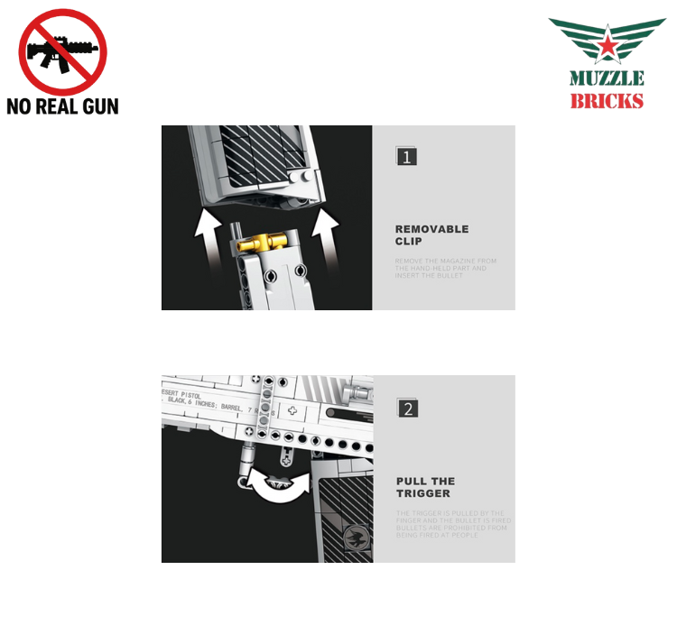 Our brick built models are designed for collectors who love detailed builds with smooth, realistic motion. Each one uses a simple system of sliding parts and brick based levers to create a satisfying mechanical action fully hand powered and completely non functional as a weapon. They make unique display pieces for anyone who enjoys clever engineering and creative design.